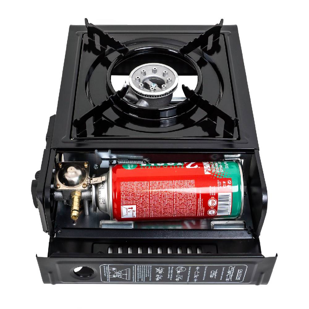 Dispune de aprindere automată integrată piezzo, astfel încât nu ai nevoie de surse de foc externe. Alimentarea este dublă: poți conecta o butelie de gaz sau utiliza spray (cartuș aerosol), ceea ce îți permite să gătești chiar și în locuri unde nu ai acces la butelie standard. Grătarul emailat facilitează curățarea după utilizare, iar carcasa robustă, neagră, și cutia practică cu mâner asigură transportul și depozitarea în siguranță.