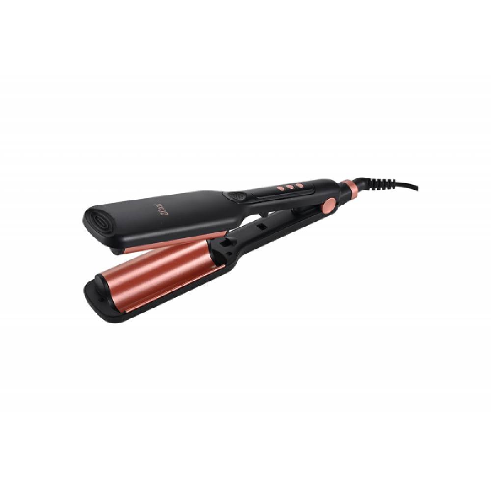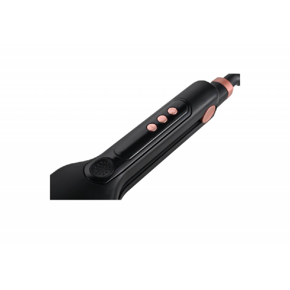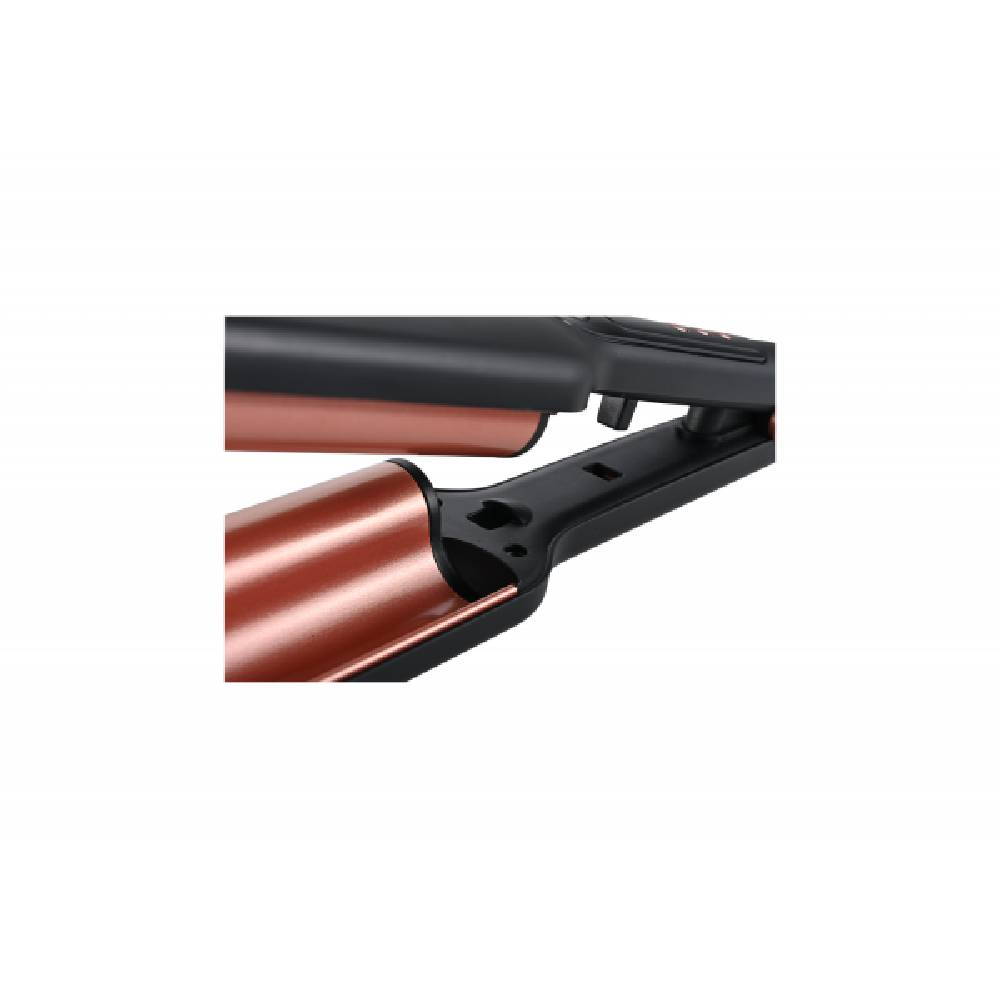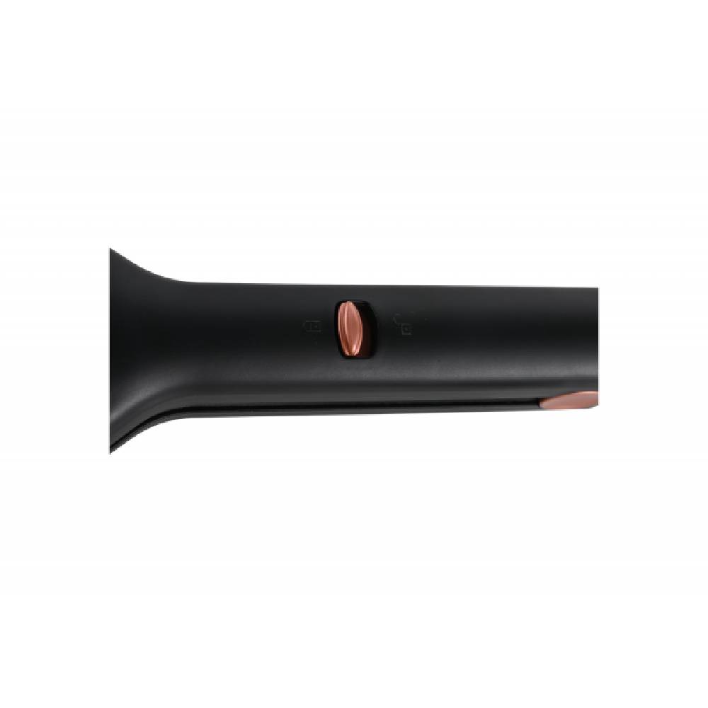 Suprafața ondulantă este construită din aluminiu acoperit cu înveliş ceramic, ceea ce ajută la distribuirea uniformă a căldurii și la protejarea părului împotriva efectului de “zăpăcit” sau deteriorare. Cablul rotativ la 360° previne încurcarea cablului în timpul coafatului, iar butonul de blocare în poziția închisă permite depozitarea ușoară și protejarea plăcii când nu este folosită.